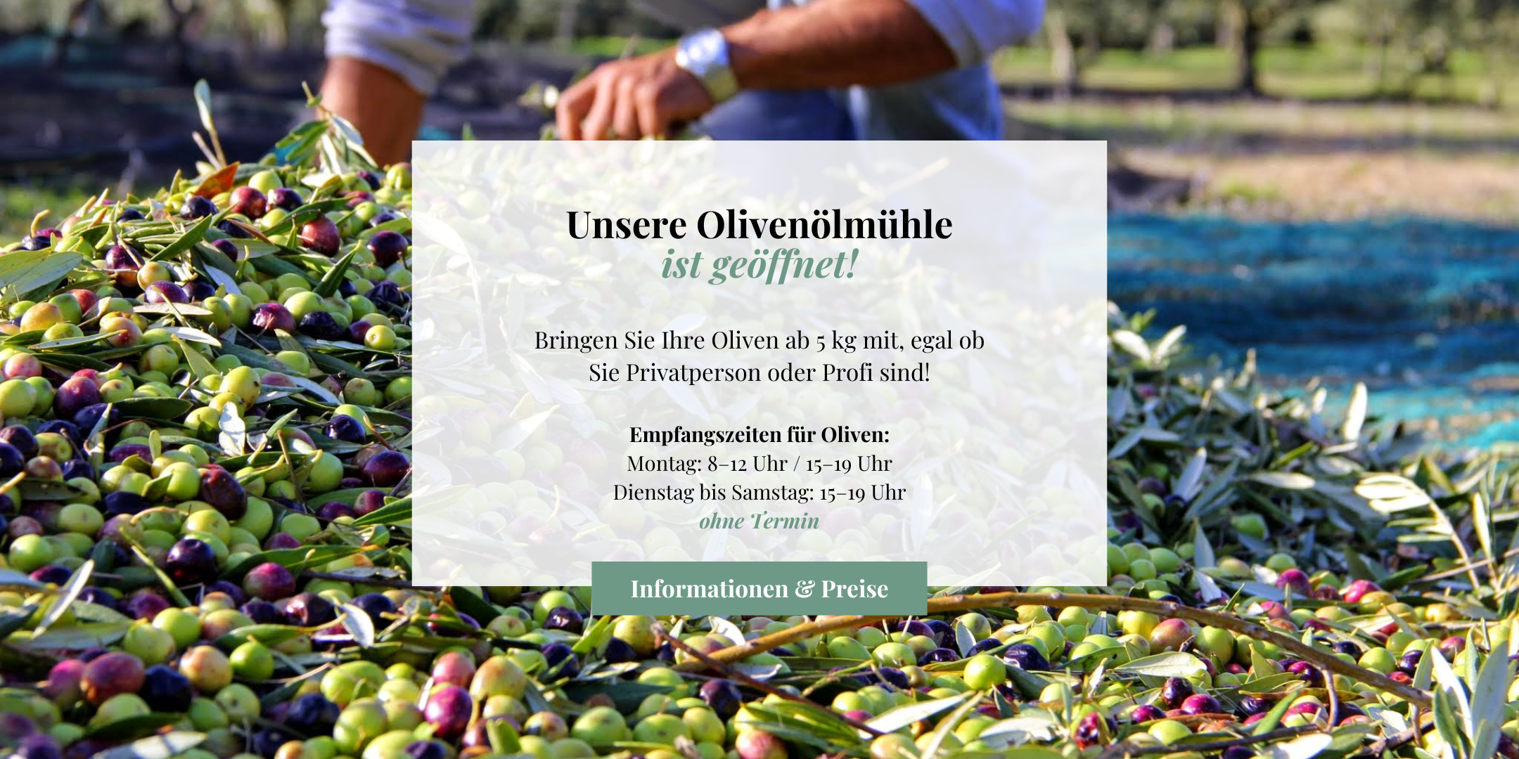 Bringen Sie Ihre Oliven ab 5 kg mit, egal ob Sie Privatperson oder Profi sind!