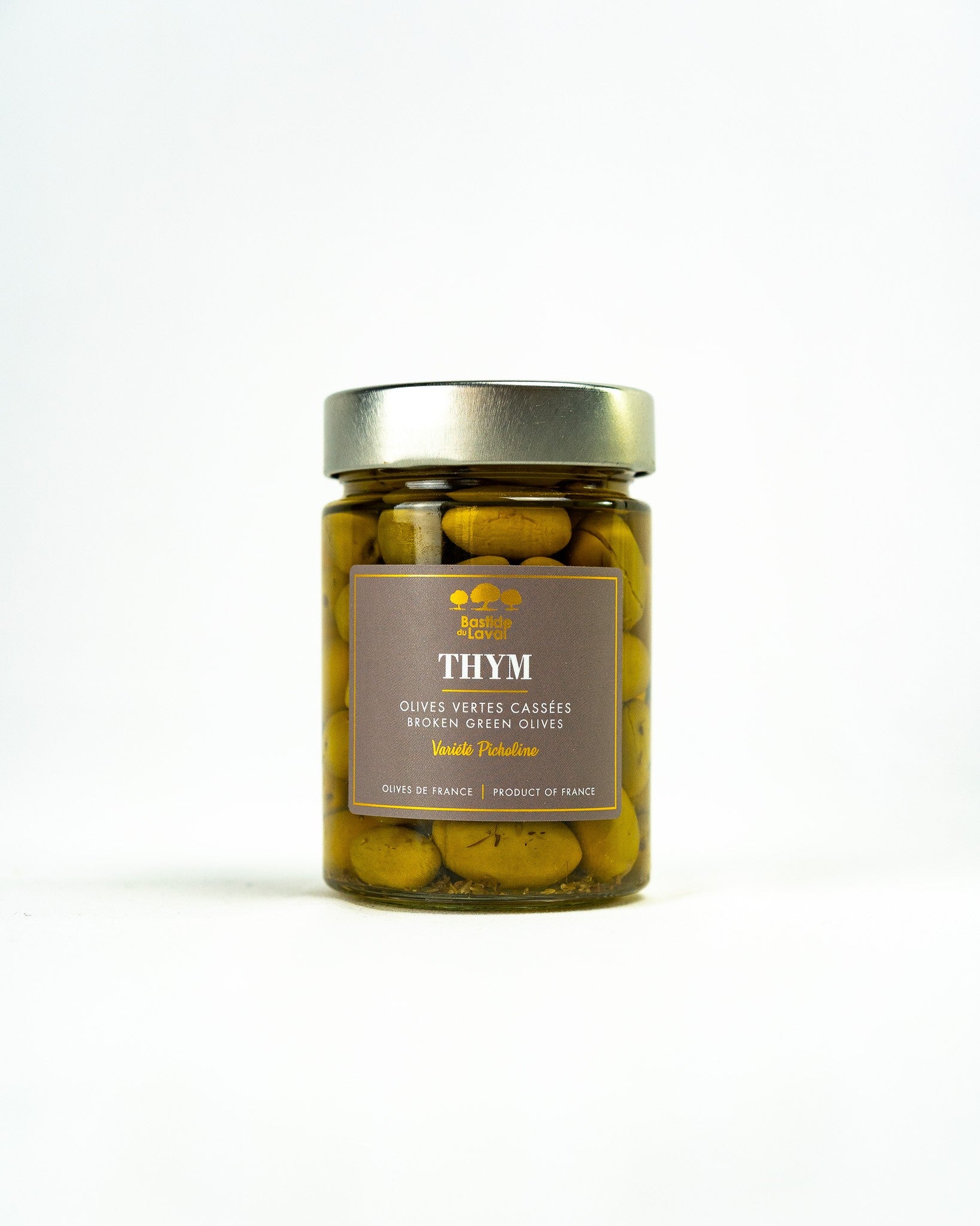 Olives vertes Picholine, thym 1%, eau, sel, acidifiant : acide citrique.